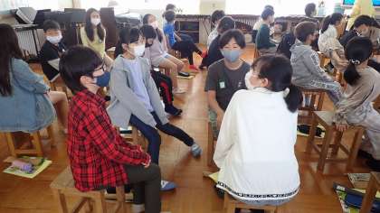 「Believe」を聴き、曲から感じ取ったことや聴き取ったことを交流しています。これから、明るく希望に満ちた歌詞や曲想に合う声で歌う学習に取り組みます。