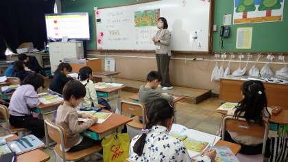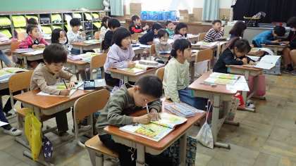 教科書の挿絵を見ながら、「○○は右から何ばんめ?」「左から3ばんめの動物は何でしょう?」など、先生の問いの答えを考えています。数字も上手にかけるようになってきましたね。