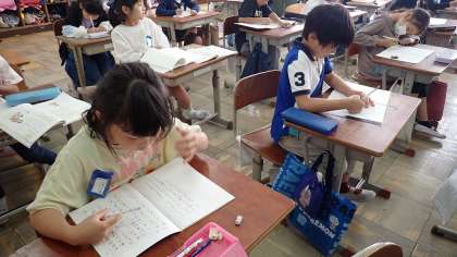 日記の書き方を確かめ、ゴールデンウィークのできごとを日記に書いていました。「 」(かっこ)を使って会話を入れたり、感想や思ったことを書き加えたりすることで、様子がよく伝わる日記になっていました。