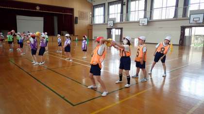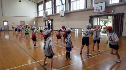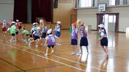 今日は、1列に並んでボールをパスするリレーをしています。後ろの人に上からパスしたり、下からパスしたり、上下交互にパスしたりと、いろいろな方法で楽しみました。