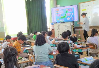 4年生の外国語活動では「How's the weather? How's the weather?♪」の音楽に合わせて天気やいろいろな遊びの表現を練習中です。表情や身振り手振りを使って、とっても楽しく盛り上がる様子も見られます。