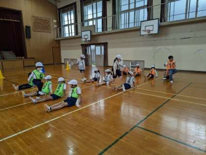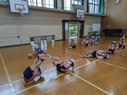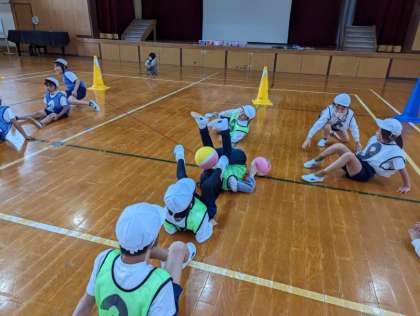 体育科の「体ほぐし」の学習で、グループごとに全員で協力してゴールを目指す運動に取り組みました。グループの子が座って伸ばした足の上をぴょんぴょんと順番に飛び越えていく運動や、ボールを上下と運ぶ運動などいろいろな体ほぐしの運動をしていきました。その中で、声を掛け合ったり応援したりする姿が見られ、素敵でした。最後は足でボールを運ぶ運動にもチャレンジし、最初はぽろぽろとボールが落ちてしまっていましたが、どんどん上手に足ででもボールを運ぶことができるようになっていきました。体全身を使っての運動なので、ご家庭でもぜひ一緒に取り組んでみてください。