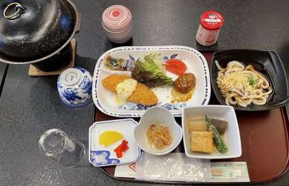 ホテルの入所式ではお世話になるスタッフの方にあいさつをしました。その後は、お待ちかねの夕食をいただいています。とても豪華な食事に、子どもたちも喜んでいるようです。