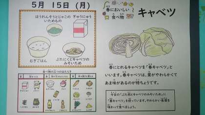 「豚肉とキャベツのみそ炒め」には、春キャベツが使われています。春キャベツは、葉のやわらかさと甘みがあるのが特徴です。みそ味がちょうどよく、ごはんが進む献立でした。キャベツのやわらかい食感を楽しんで、おいしくいただきました。