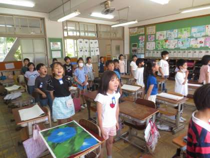全校合唱の「やあ!」は、少しでも1年生に届くように、1年生がいる体育館の方を向いて、元気に歌いました。