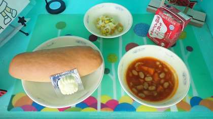 「大豆と鶏肉のトマト煮」には、たっぷりの大豆が入っています。やわらかくほくほくの大豆とにんじんは鶏肉とよく合い、ほどよいトマト味でおいしくいただくことができました。「野菜のソテー」のキャベツも甘くてとてもやわらかく、コーンの甘みと一緒においしくいただきました。