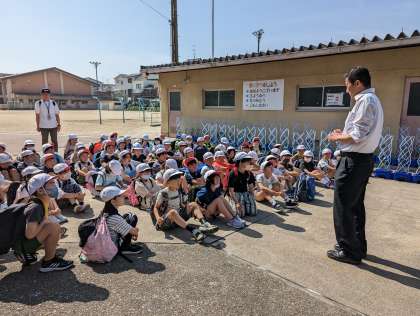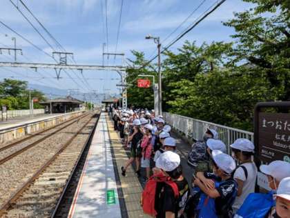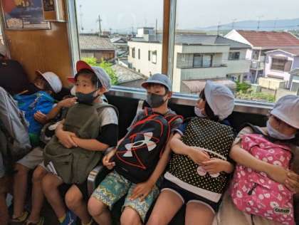 とても良い天気で遠足日和でした。社会見学で京都市にはどんな所があるのか実際に市内をめぐって見に行きました。阪急電車に乗って、まずは四条烏丸へ。公共交通マナーも意識できていました。