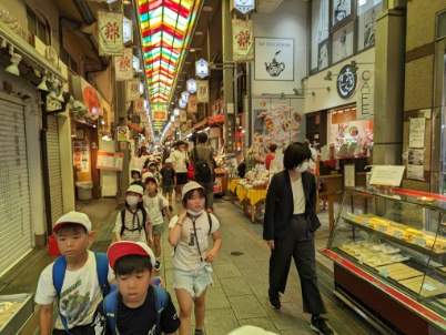 四条通りを後にして錦市場へ行きました。狭い道ながら両サイドからとてもいい匂いが漂ってきて、「先生お腹すいた」「おいしそう」と口々に言っていました。外国の方もたくさん来られていて、「ハロー」と声をかけている子もいました。ぜひ食べ歩きに改めて行きたいなと思います。