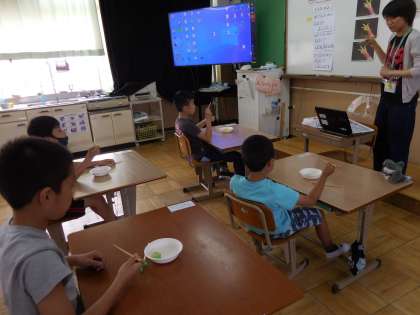 「正しいおはしの持ち方」について学習しました。栄養教諭の先生に紙芝居を読んでもらい、実際に正しいおはしの持ち方を確認しました。
