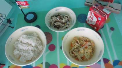 今日は、5月15日の「沖縄返還の日」にちなんだ献立です。「チャンプル」とは、「混ぜ合わせたもの」という意味で、野菜やとうふを混ぜた料理です。今日の給食では、油あげと野菜を使って作りました。「クーブ」は「こんぶ」、「イリチ—」は「いため煮」という意味です。食材にしみ込んだこんぶのうまみを味わって、おいしくいただきました。