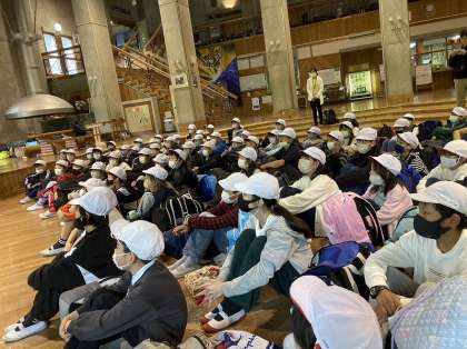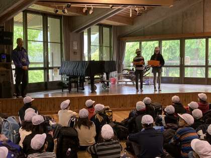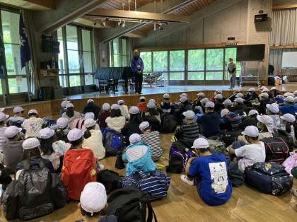 お話をしてくださった山の家の所員さんが、梅津小学校の先輩だったそうで子どもたちもびっくりしていました。しっかりお話を聞き、入所式を終えることができました。