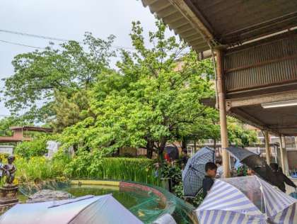 いろどりタイムの学習で自分たちの住んでいる梅津の町が梅の木と関わりがあることを知り、学校にも梅の木があり、「何本くらいあるんだろう」ということで雨の中でしたが探しに行きました。池のところに2本と長福寺側のところに4本と正面玄関のところに2本の合計8本見つけることができ、「思っていたよりいっぱいあった」「上のほうにいっぱい梅の実がなっていた」と発見があったようです。