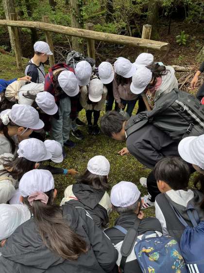 何を見つけたのでしょうか。みんなじっくり地面を観察しています。(ひょっとすると、「ヤマビル」がいるのかもしれません。)