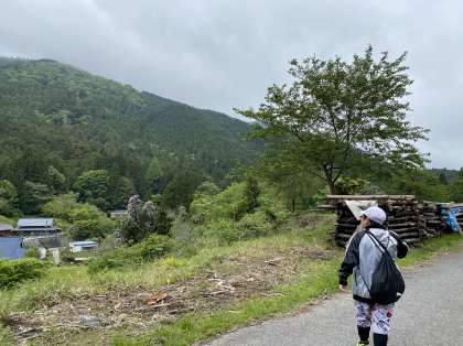 歩いていくと、少し開けたところもあります。下のほうに道路が見えます。ずいぶんと登ってきたようです。