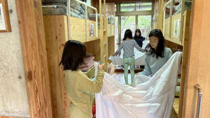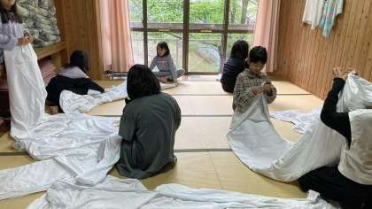 昨日の疲れもあり、ぐっすり眠ることができたようです。起きた後は、眠い目をこすりながら身支度と寝具の片づけをしています。シーツをたたむのは、友達と2人組で上手に行っています。