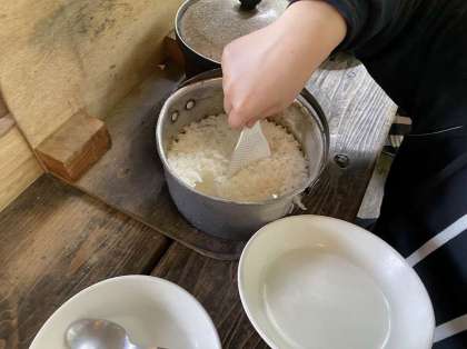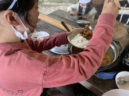 ごはんも上手にたけているようです。ごはんの上にたっぷりとカレーをかけて「いただきます」!