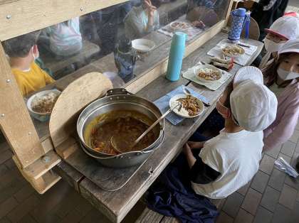 グループのみんなと一緒に、おいしくカレーライスを食べています。