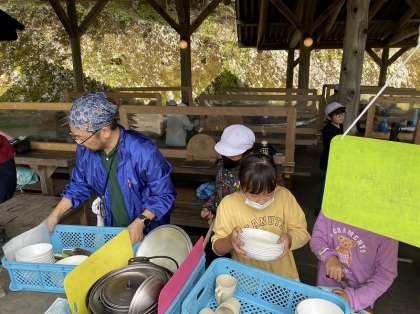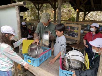 洗い終わった食器やお鍋を山の家の所員さんに点検していただきました。どのグループも合格です!お世話になった所員の方にお礼を伝えました。