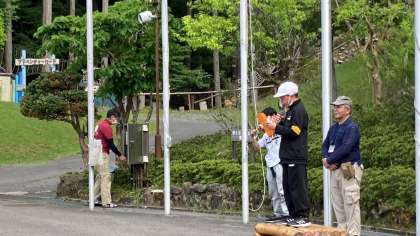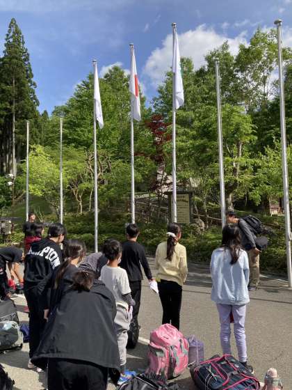 山の家のスタッフの方のお話のあと、校歌を歌って、初日に揚げた校旗を降ろしました。また、3日間お世話になったカメラマンさんにお礼とお別れのあいさつをしました。
