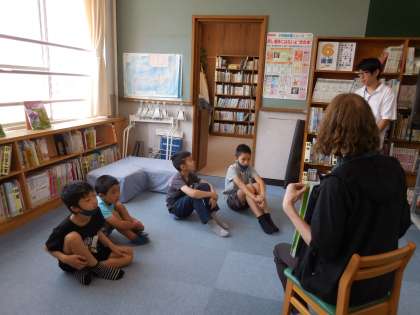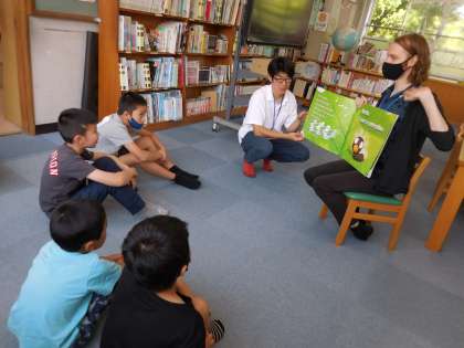 自己紹介した後には、一緒に本のもりへ行きました。