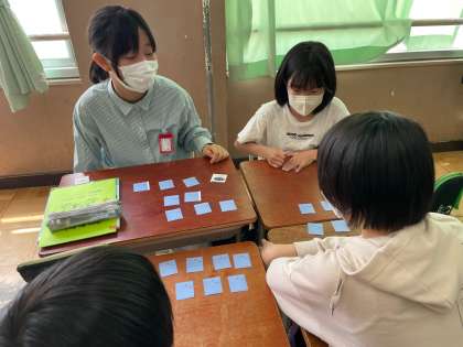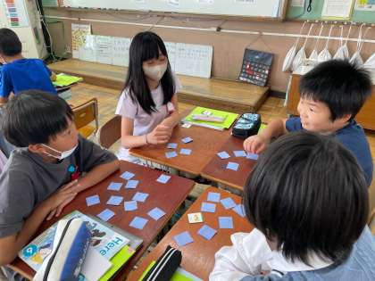 季節が書かれたカードと行事の書かれたカードを合わせる、マッチングゲームをしました。「In summer. 」「We have a summer festival. 」など、元気な声が聞こえてきました。