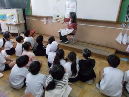 1組は、6月4日からの「歯と口の健康週間」にちなんだ歯に関する物語でした。2年生の子どもたちも、主人公と同じ歯の生え変わり時期の真っただ中です。自分の歯の様子と重ねながら聞いている様子でした。歯の模型も見せてもらって興味津々な子どもたちでした。