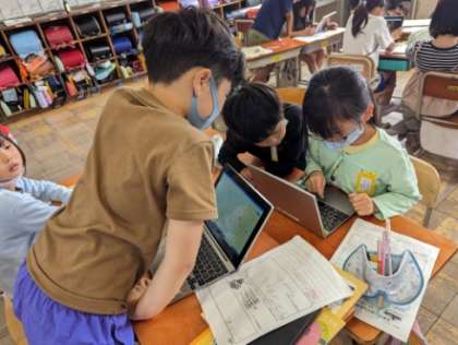 社会見学の市内めぐりで行ってきた四条烏丸周辺の様子を、グループごとにまとめていきました。見学ノートやタブレットのストリートビューなどを使って、建物の様子や人々の様子について話し合いながら進めていきました。実際に見学してきたので、いろいろ話が出てきて盛り上がりながらまとめていました。次回は、このまとめをもとにミッションカードに挑戦します。
