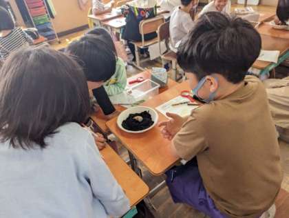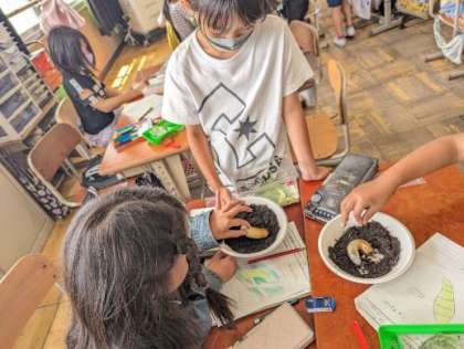 モンシロチョウと幼虫と合わせて、カブトムシの幼虫を比較のために観察しました。あまりの大きさの違いに最初はぎょっとしていましたが、しだいに慣れてきたのか「初めて触った」「なんかかわいくなってきた」と、手に取って観察していました。色や形大きさなど全然違い新しい発見があったようです。