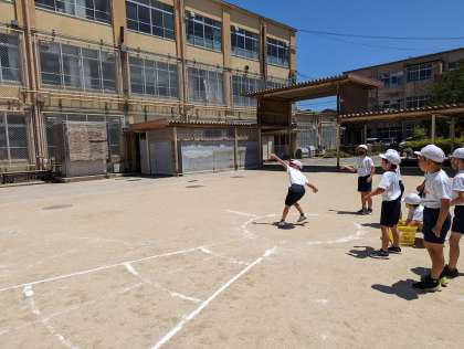 体力テストで今回取り組んだのは、“ソフトボール投げ”です。3年生の手には少し大きなボールですが、しっかり反対の手をあげてその手に向かって思いっきり投げていました。横にとんだり手前に飛んだりもありましたが、一番遠くまで投げられた子は、30mを超えていました。晴天の下、白いボールがよく飛んでいきました。周りのボール拾いも頑張ってくれました。