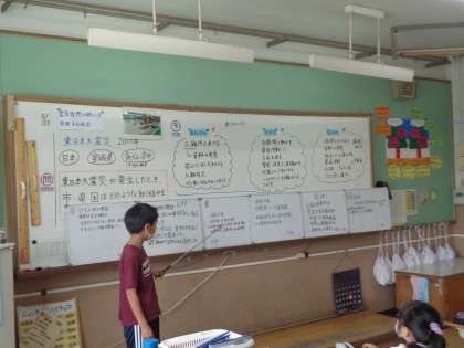 東日本大震災が発生したときに、市・県・国がどのような取り組みを行ったのか考えました。これまでの学習を活かして予想し、調べていきました。調べたことを交流し、様々な取組が行われていたことがわかりました。