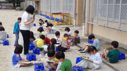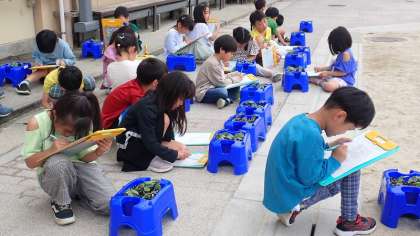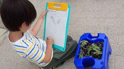 種をまいてから毎日水やりをしているアサガオが芽を出しています。「ふたば」が大きくなっている様子を観察してカードに記録いています。細かいところまでよく観察して書いている子がたくさんいました。