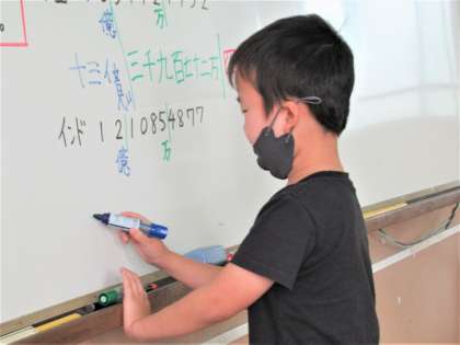 算数科は『一億をこえる数』の学習に入りました。昨年度までの学習の積み重ねが生かされているため、「簡単!簡単!」と楽しそうに問題に取り組み始めた子どもたちでしたが……十億、一兆と数が大きくなると、漢字で書き表す際にうっかりミスすることもあります。単位ごとに区切ったり印をつけたりして、1つ1つ確認しながら数を書いていきました。