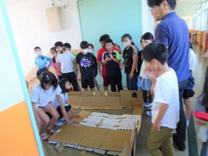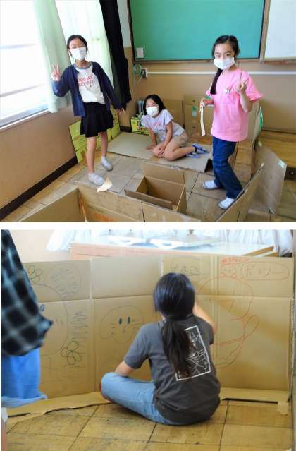 4年生の図画工作科『ここにいたい』の学習では、段ボールを使って自分達の居場所作りを楽しみます。水曜日は3組が先行して学習を行いました。