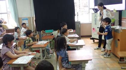 拍に乗って手拍子をしながら、友達同士で呼びかけ合ったり、歌に合わせて拍を打ったりして楽しく学習しています。