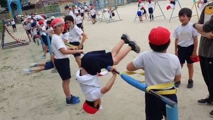 上がり技、回転技、下りる技の練習や、連続技の組み合わせの工夫などをしています。うまく回るコツを見つけることができた子は、友達にもやさしく教えてあげていました。