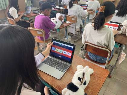 国語科の学習では、「木を」「植えた」「庭に」「ぼくは」「昨日」のカードをロイロノートを使って、並びかえました。出来上がった文を読んでみると…「植えた」のカードだけは、みんなそろって一番後ろに並べていました。述語書き言葉ではふつう、文末に置くことに気づくことができました。
