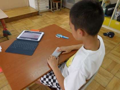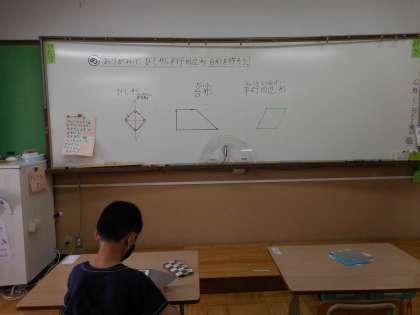 ひし形・台形・平行四辺形について学習をしています。実際に描いてみたり、折り紙で折ってみたりして、本当にその図形になっているのかを話し合いました。何度も「これでできたかな。」と考えてやってみながら取り組んでいました。