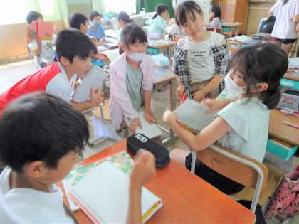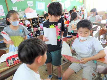 休日参観でご覧いただいた授業の続きを火曜日に行いました。教科書に書いてある文の続きを、自分たちで自由に考える問題です。ただし、間には自分でぴったりな「つなぎ言葉」を考えて入れなければなりません。友だちとの紹介タイムでは、どんな文章ができたか大盛り上がりで交流していました。