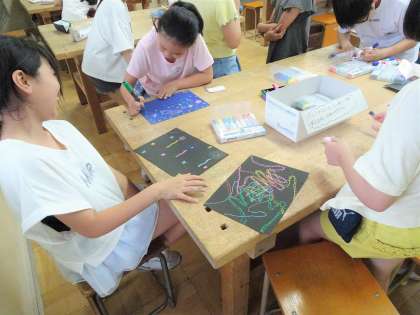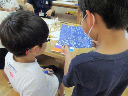 おもちゃ作りは、飛ばしても元通りに立つUFOやブーメランづくりを楽しみ、アボリジニアートではポスターカラーのペンを使って、色画用紙に模様を描いていきました。濃い色の画用紙でもポスターカラーの使うと、はっきりくっきり模様が浮かびます。