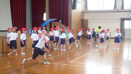 フラフープやバトンなど、いろいろな用具を使って体を動かして遊びました。スポンジのロケットを遠くまで飛ばす活動では、どんな投げ方をするとより遠くまで飛ばすことができるかを考えながら活動しました。