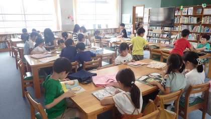 1年生は、「本のもり(学校図書館)」で本を借りたり、読んだりしています。