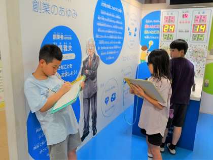 殿堂学習では、それぞれ自分の学習課題を自由に解決して回ります。ブースには京都に所縁のある様々な企業のパネルや作られているものの実物が展示されていました。子どもたちは、パネルを読みながら企業の考えや歴史、作られたものが何に使われているかなどを興味深く読んでいました。