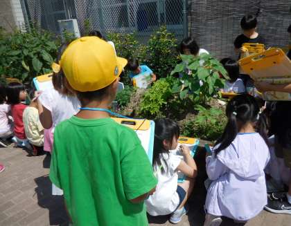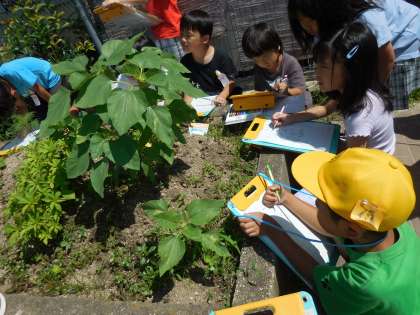 交流学級で生活科の学習をしています。ひまわりを種の時から観察し、芽が出た時、葉がたくさん付いてきた時など成長の経過を観察しています。葉の色をよく観察し、緑と黄緑が混ざっていることや黄色が混じっていることなどに気づいていました。