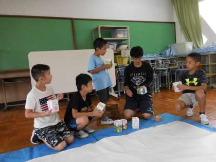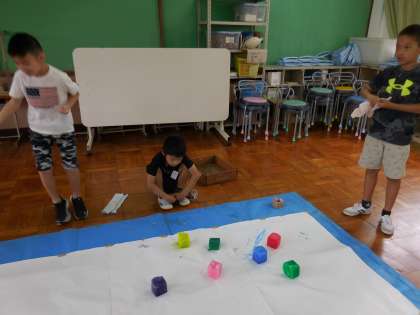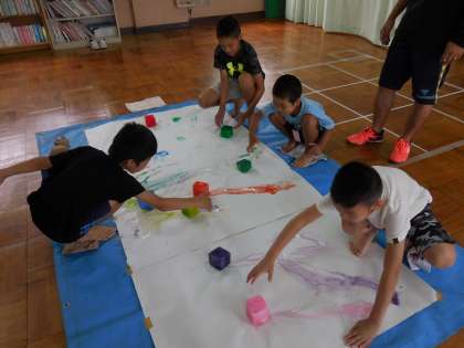 絵の具をといた水を前日に凍らせて、色水を氷にしました。子どもたちは大興奮で、「昨日と形が変わってる。」「冷たくて気持ちよい。」と触っていました。氷なので、触っていくうちに融け出し、「また水に戻ってきた。」と楽しんでいました。