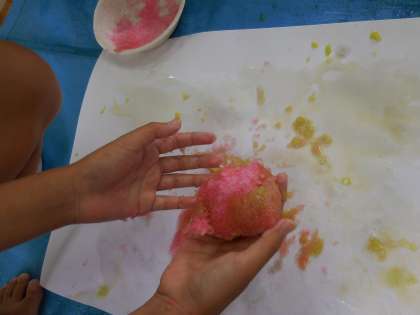 氷の塊を十分に楽しんだ後は、かき氷機で氷をシャーベット状にしました。色とりどりのお皿に乗ったものを見て、「むらさきはぶどうのかき氷や。」「緑はメロン味。」「ピンクはいちご味。」などかき氷に見立てていました。氷の塊とはまた違った感触で、「硬かったのにふわふわになったよ。」と手の平いっぱいに持っていました。