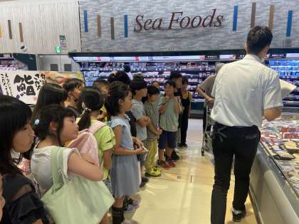 社会科の学習では、商店のはたらきについて学習をしています。今日の社会では、地域にあるスーパーマーケットに社会見学へ行きました。お店の中の様子を一通り紹介してもらった後に、お店の裏側を見せてもらいました。