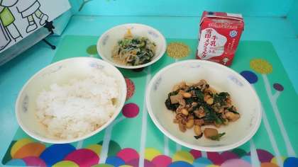 「肉みそ炒め」は、豚肉、大豆、ほうれん草、こんにゃくなどたくさんの具材が入っていますが、いろいろな具材がみそ味でひとつにまとまり、食べ応えも満点です。ごはんによく合う献立で、ごはんと交互に食べると、いつも以上にごはんが進みました。