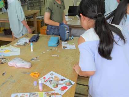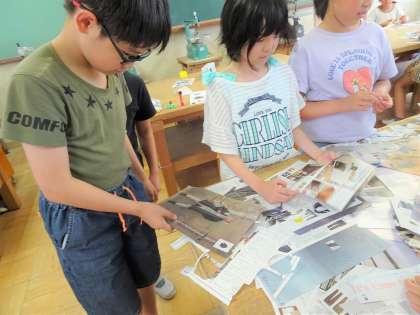 久しぶりのアート部では、古い雑誌を使ってコラージュを作りました。たくさんの雑誌は宝の山!1ページずつ手に取って、自分の作品に使えそうな部分を探していきます。