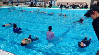 最後の水泳学習の時間となる今日は、「着衣水泳」を行いました。水着の上から服を着てプールに入ると、服が水を吸いこみとても動きにくくなることに気づきました。想像以上の影響に子どもたちも驚き、「ういてまつ」ことの難しさを感じていました。