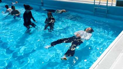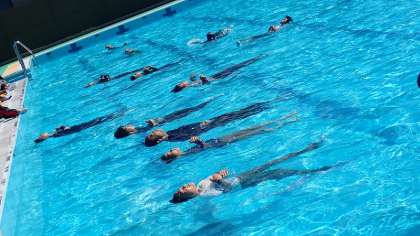 次に、「浮き」としてペットボトルをもってプールに入りました。1.5Lや2.0Lのペットボトルに入った空気でも、十分に体を浮かせる助けになることを感じることができました。